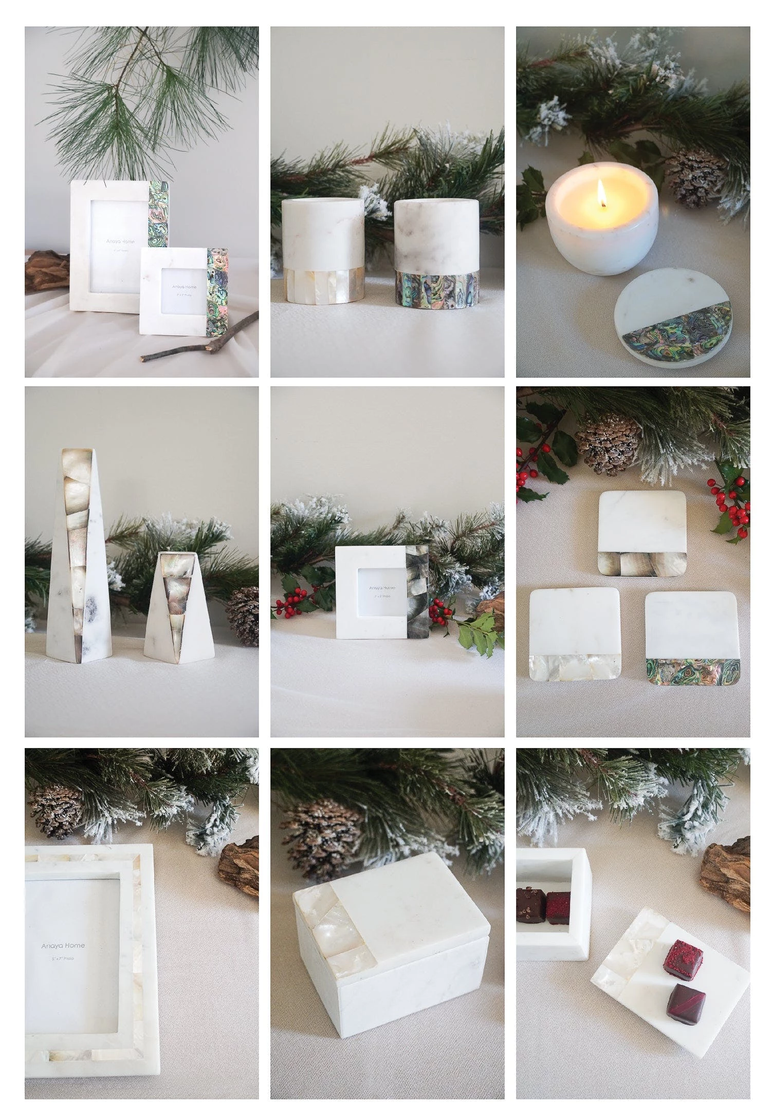 The Anaya Mother of Pearl Holiday Collection features most special Luxe Gifts you can give this holiday season.Each item is hand made by artisans in the city of the Taj Mahal, where they hand cut each piece of Mother of Pearl and inlay into White Marble.This collection will be the only shopping you will need to do this holiday season, as these make beautiful hostess gifts.