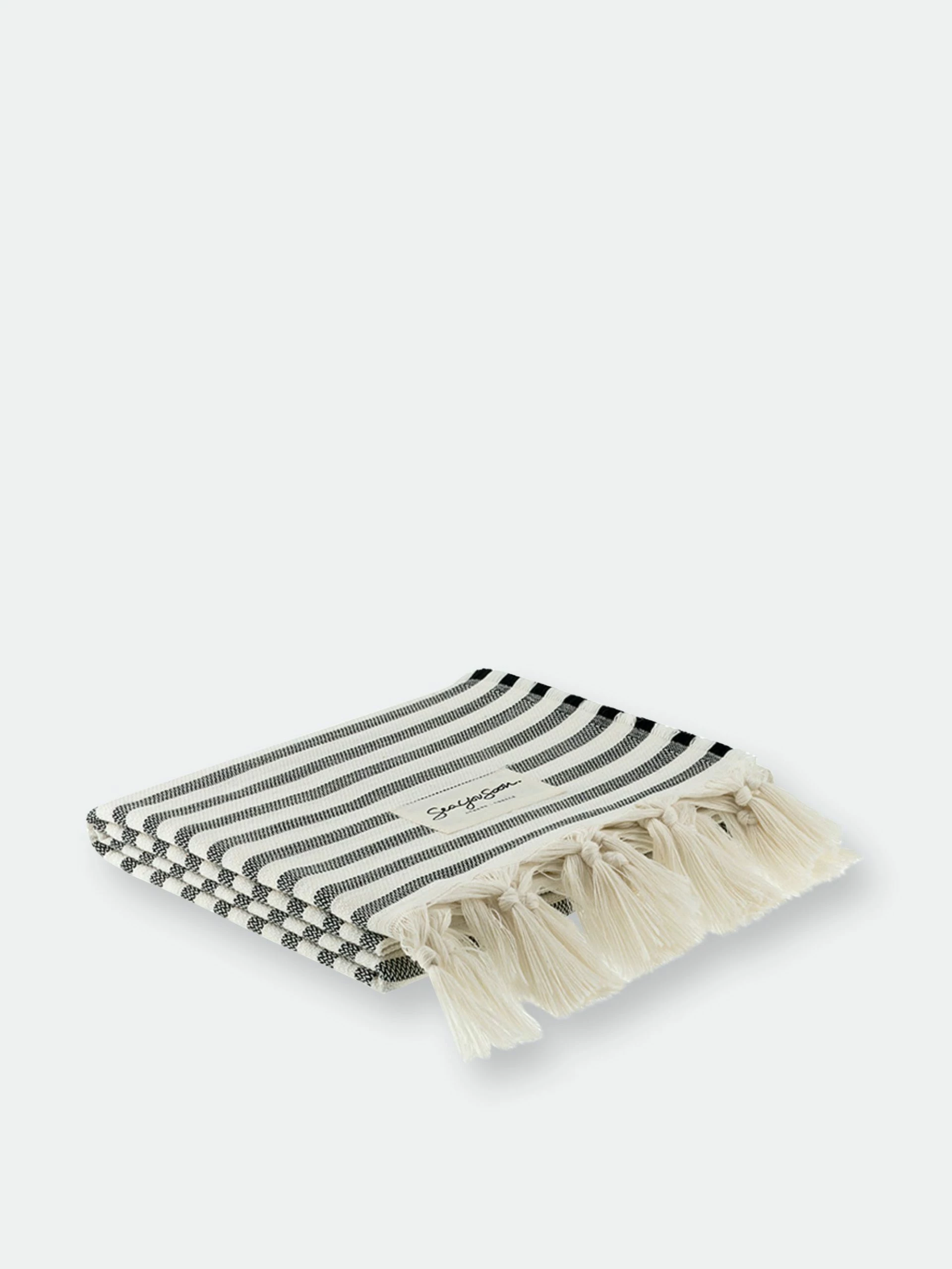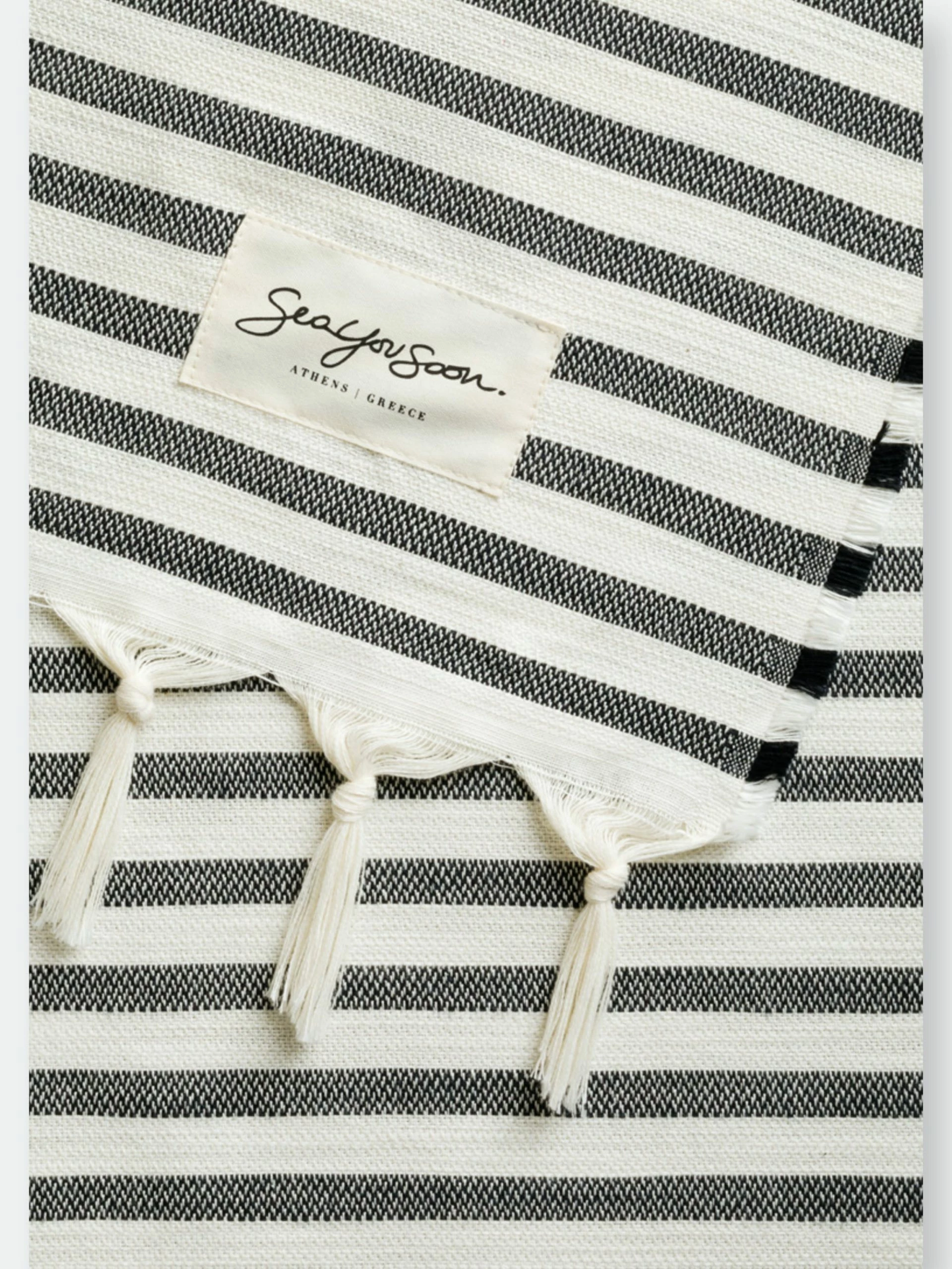 This lightweight Tinetto towel was designed by SEA YOU SOON, with an eco-conscious philosophy in mind.Created by local weavers and tassel-makers in Greece and Turkey, each sand-resistant towel can also be used as a beach mat, and their oversized yet lightweight nature allows them to instantly transform into a sarong or cover-up, making them the ideal companion for your beach escapes and seaside adventures.The Tinetto towel is made of both high-quality cotton and renewable TENCEL fibers of botanic origin, offering sustainable elegance at its very best.Tencel fibers are beautifully breathable and gentle on the skin, upholding the highest standards of the environment whilst making the perfect companion for hot summer days.Tencel fibers also significantly reduce bacterial growth, making the Tinetto marvelously mold-resistant, with their magical properties producing a hard-wearing towel which remains sumptuously supple even after repeated washings, leaving you free to explore even the remotest of terrains, no matter where your spirit may guide you.