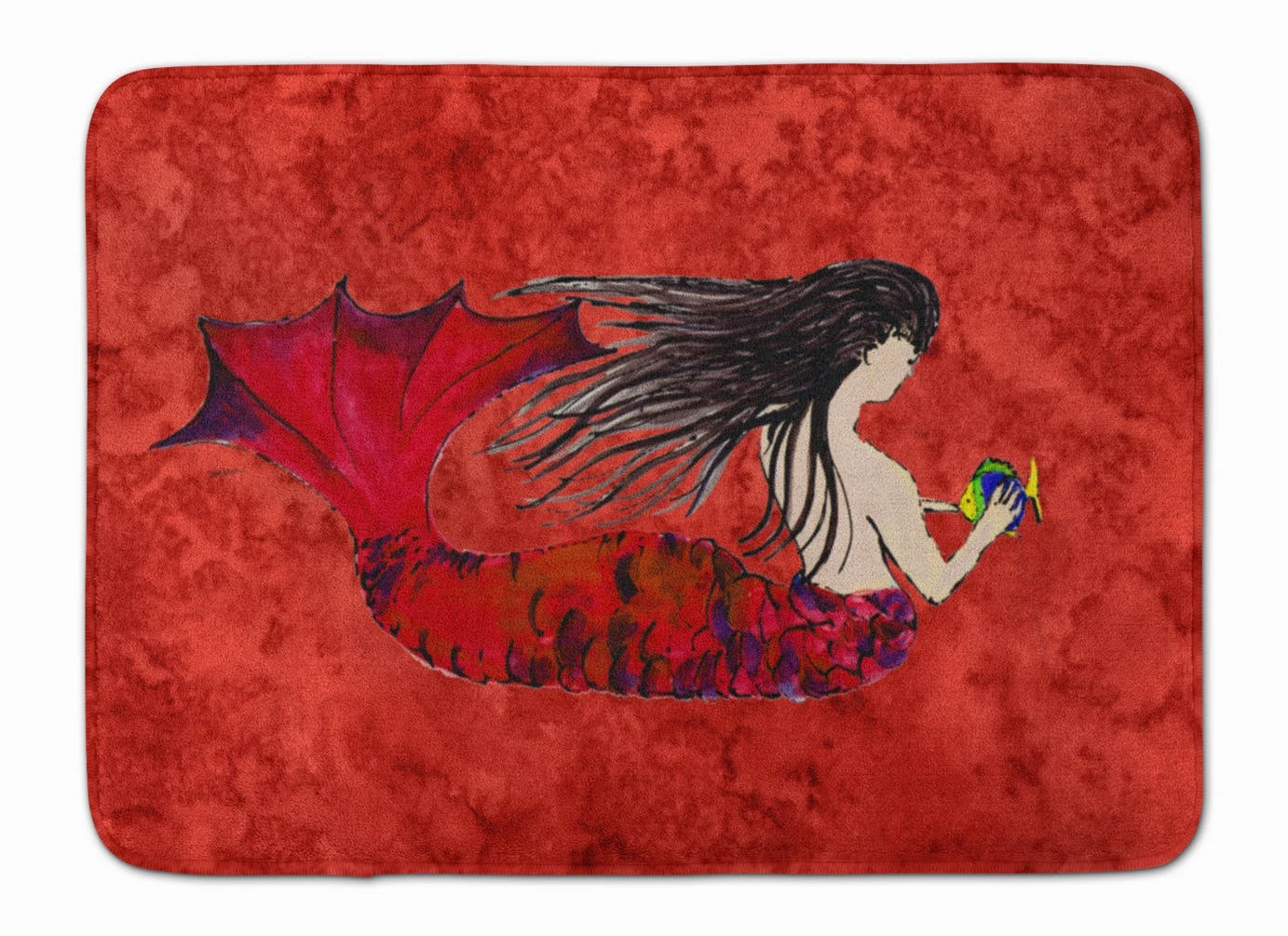 Black Haired Mermaid on Red Machine Washable Memory Foam Mat. Artwork on the floor of your bathroom. Plush top and very comfortable to the touch. This is a Machine Washable bath or kitchen mat that is made with Memory Foam. It features a top surface in coral fleece and is made using 100% microfiber fabric. The entire surface is full-cushion memory foam, ensuring the ultimate in comfort. The underside of the mat features a non-skid SBR surface for the best in safety and convenience. It measures 19 inches by 27 inches and is Proudly Printed in the USA with artwork from our licensed Artists. The design is dyed into the fibers of the rug for a long lasting image. Wash in cold water and dry in the dryer on low temp. Follow the care instructions on the product tag.
