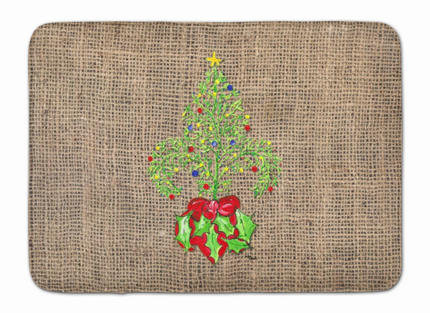 Christmas Tree Fleur de lis on Faux Burlap Machine Washable Memory Foam Mat. Celebrate Christmas with this Christmas Floor Mat. Artwork on the floor of your bathroom. Plush top and very comfortable to the touch. This is a Machine Washable bath or kitchen mat that is made with Memory Foam. It features a top surface in coral fleece and is made using 100% microfiber fabric. The entire surface is full-cushion memory foam, ensuring the ultimate in comfort. The underside of the mat features a non-skid SBR surface for the best in safety and convenience. It measures 19 inches by 27 inches and is Proudly Printed in the USA with artwork from our licensed Artists. The design is dyed into the fibers of the rug for a long lasting image. Wash in cold water and dry in the dryer on low temp. Follow the care instructions on the product tag.