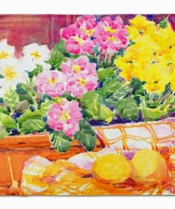 Flower – Primroses Machine Washable Memory Foam Mat. Artwork on the floor of your bathroom. Plush top and very comfortable to the touch. This is a Machine Washable bath or kitchen mat that is made with Memory Foam. It features a top surface in coral fleece and is made using 100% microfiber fabric. The entire surface is full-cushion memory foam, ensuring the ultimate in comfort. The underside of the mat features a non-skid SBR surface for the best in safety and convenience. It measures 19 inches by 27 inches and is Proudly Printed in the USA with artwork from our licensed Artists. The design is dyed into the fibers of the rug for a long lasting image. Wash in cold water and dry in the dryer on low temp. Follow the care instructions on the product tag.