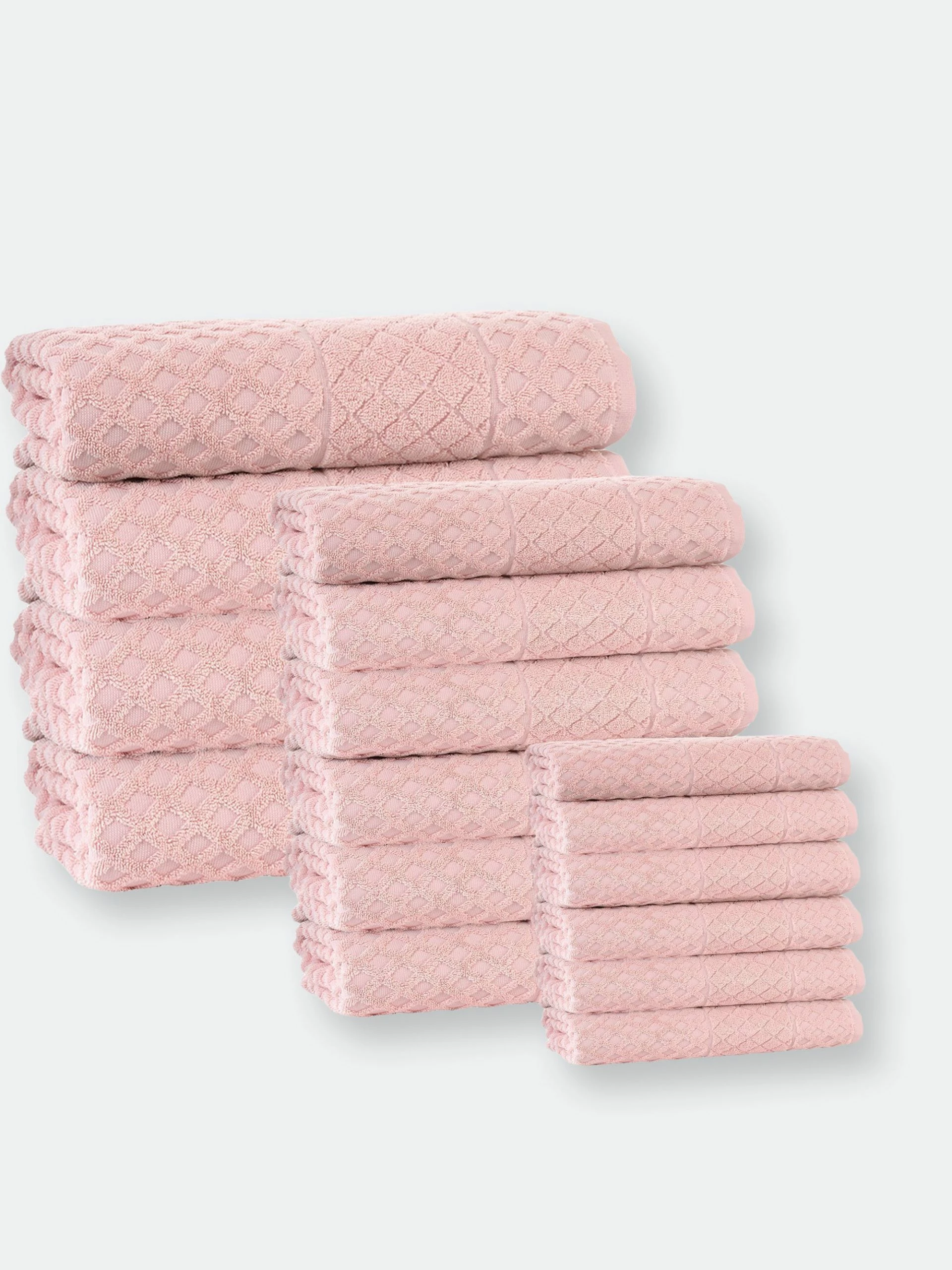 Soft, two-ply terry cloth with a 650 GSM rating is excellent for absorbing moisture. You’ll love the plush and luxurious 100-percent Turkish cotton. Designed in the U.S.A and made in Turkey, these towels are 100% authentic, make from long-strand Turkish cotton to create a soft, durable, and extra absorbent material that will make your home feel like a spa for years to come. It was weaved into a variety of lavish designs, sizes, and shapes to be sure of its quality, durability, and softness. 100% combed long-staple Turkish CottonFabric Weight: 650 GSMLuxury and long-lasting product, quick dryMachine wash warm, tumble dry low, wash deep colors separately, do not bleachPieces Included: 4 Bath towels, 6 hand towels and 6 washclothesSize: 27’x54′ bath towels; 16’x28′ hand towels; and 12’x12′ washcloths