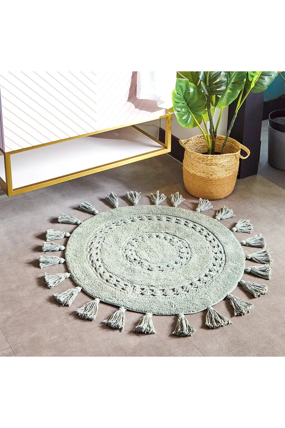 Bring the boho flair to your bathroom with the circle tassel bath mat. This 100% cotton bath mat features a beautiful mandala woven design and is complete with thick tassel edging. This design is also quick-drying with an anti-slip quality, keeping it in place on your bathroom floor.