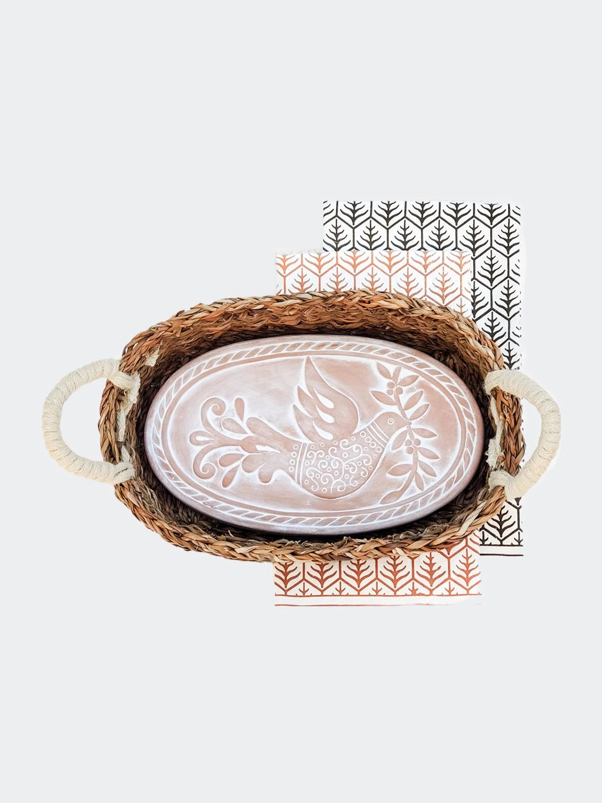 Add a bit of artisan inspired style to the kitchen with a terracotta bread warmer and hand screen printed tea towel. Engraved with a bird & leaf design and cut to fit neatly into an oval basket. This terracotta special bread warmer is naturally insulating and the basket itself has been handwoven from sustainably grown seagrass. The tea towel is great for drying dishes or hands in the kitchen, lining a bread basket. They are the best gift items for anyone who loves bread!