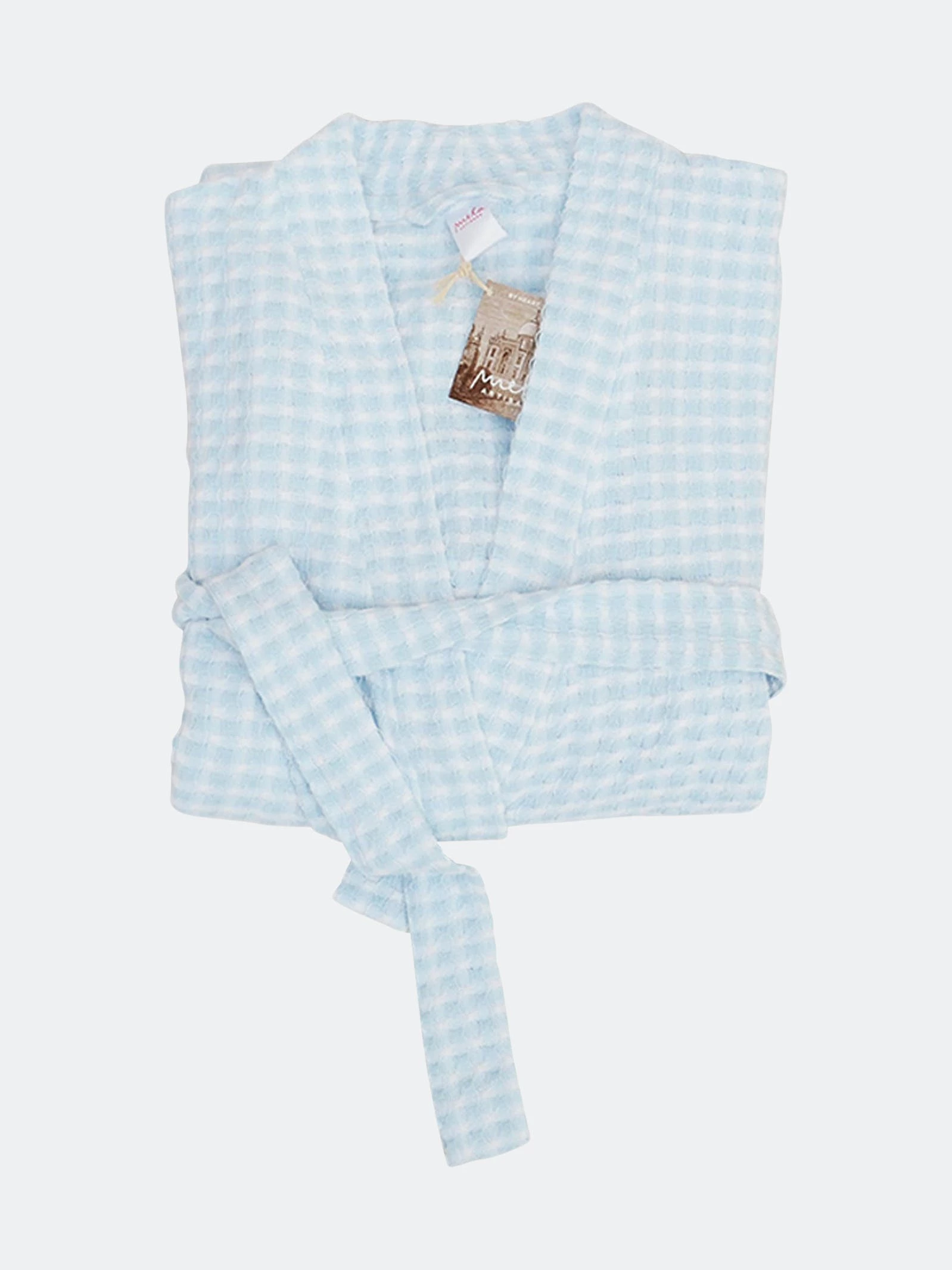 Au Natural Organic Cotton Bath Robe in Blue & Off White Part of the Au Natural Collection. Enjoy the ease of the rustic elements of the Mela Artisans Au Natural Collection. The stillness and serenity of the Au Natural Repose textiles instill a sense of tranquility and renewal. Get swaddled in this cushy Au Natural Repose waffle bath robe.