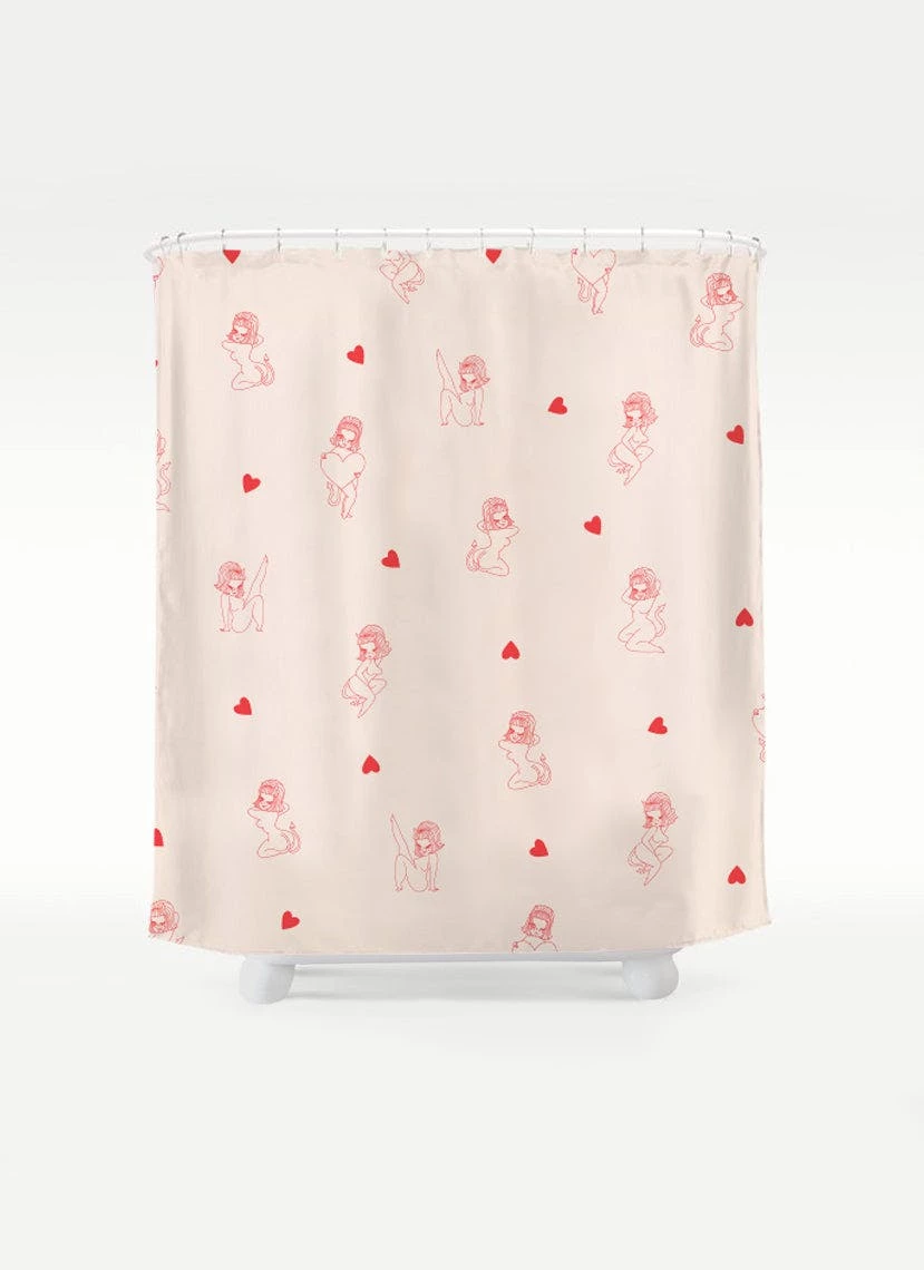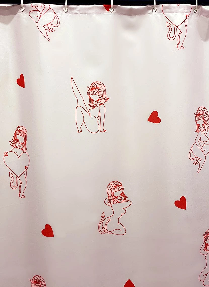 Give your bathroom a fire make-over with this pink and red shower curtain. Includes hooks and perforations on the top for easy hanging. Featuring original ValfrΓ© Lucy artwork.
