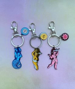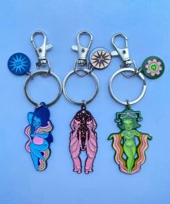 This charm keychain features metal edging and colorful enamel filling complete with a bottle opener, chain link, and key ring.